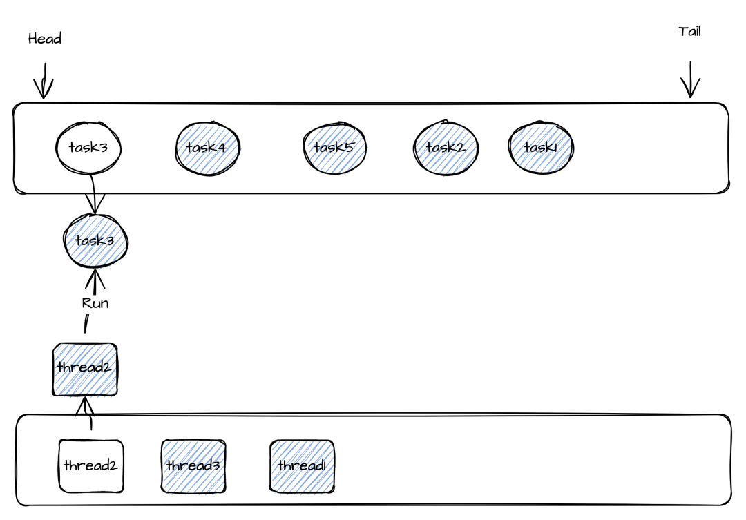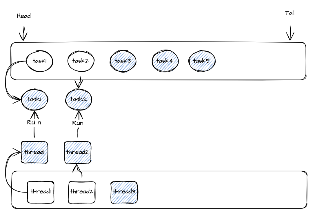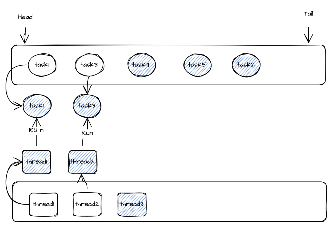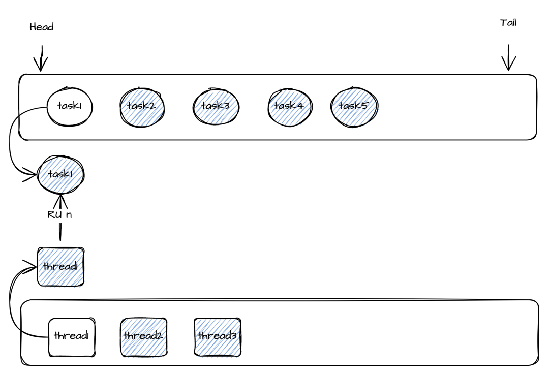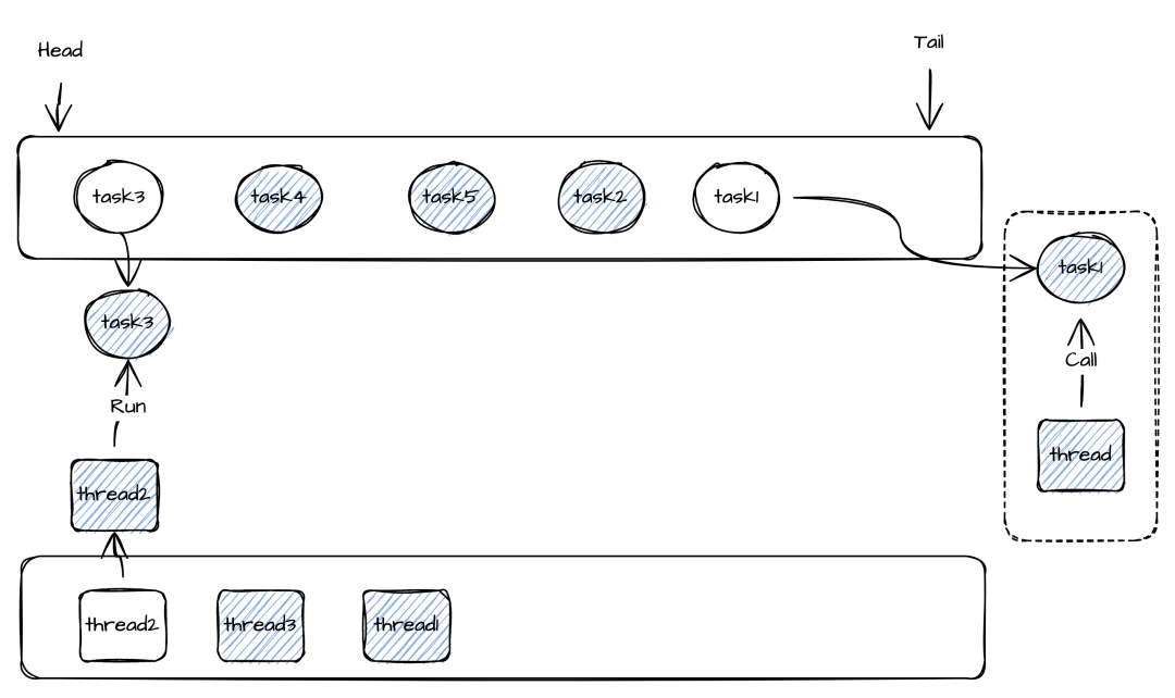 所以可以让Task线程共享变成动态的,并且一组Task由一个线程池负责执行(Task数量 >> 线程数)。在thread1执行的过程中若Task1的call()方法执行时间超过了设定值(100ms),这时候就会从线程池取出一个线程thread2去执行下一个Task2的Call方法。保证不会因为Task1执行时间太长从而导致其他Task延迟太高。