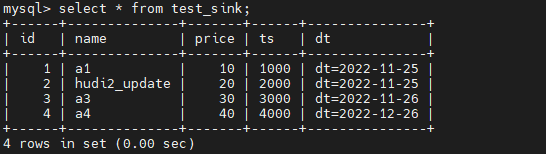 验证是否可以查询历史记录,我们更新id为2的name,更新前name为a2,更新后为hudi2_update,我们验证一下,是否可以通过FlinkSQL查询Hudi历史记录,预期结果查出id=2,name=a2
