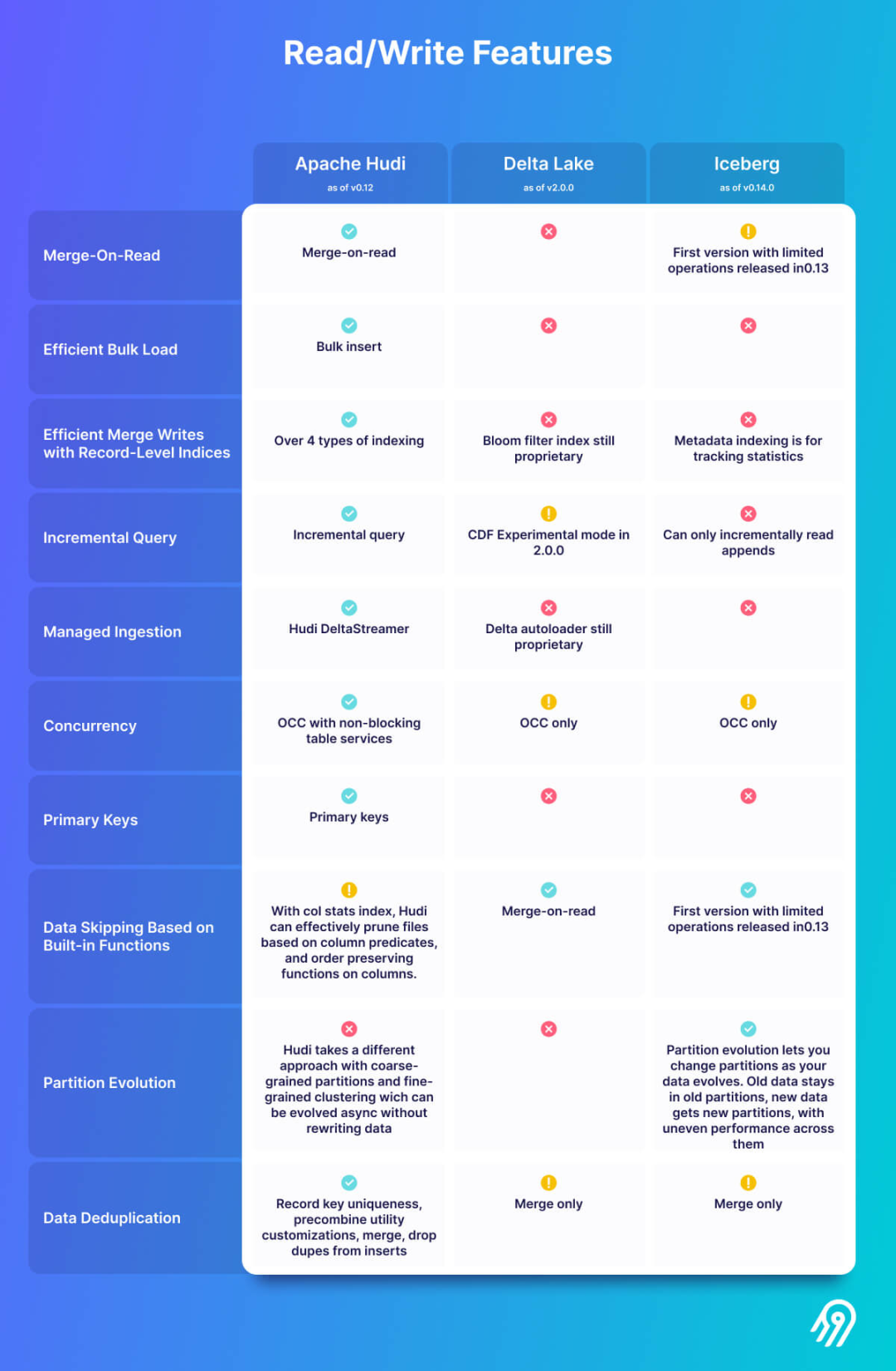 Onehouse.ai: [https://www.onehouse.ai/blog/apache-hudi-vs-delta-lake-vs-apache-iceberg-lakehouse-feature-comparison](https://www.onehouse.ai/blog/apache-hudi-vs-delta-lake-vs-apache-iceberg-lakehouse-feature-comparison)[49]