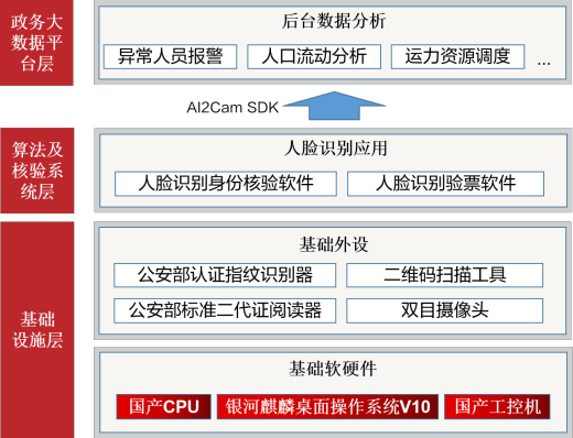 本方案通过丰富的硬件支持、完善的软件生态适配和便捷的运维管理完美适应客运检票应用场景,支持自动抓拍可见光最佳人脸进行活体检测,通过自动读取身份证阅读器照片并和当前人脸比对,同时提供比对记录查询、比对门限和比对超时时间设置、活体检测启用和关闭设置等实用功能;方案采用AI2Cam SDK形式提供人脸AI相机设备的上位机软件二次开发工具包,使用API接口可帮助开发者忽略底层实现,专注于应用逻辑调用,可进行快速开发。方案适用于各类检票及身份核验场景,如地铁、汽车站、客运站、景区等。并可拓展至电子政务各类自助机,窗口化办公等场景下进行人脸身份核验。