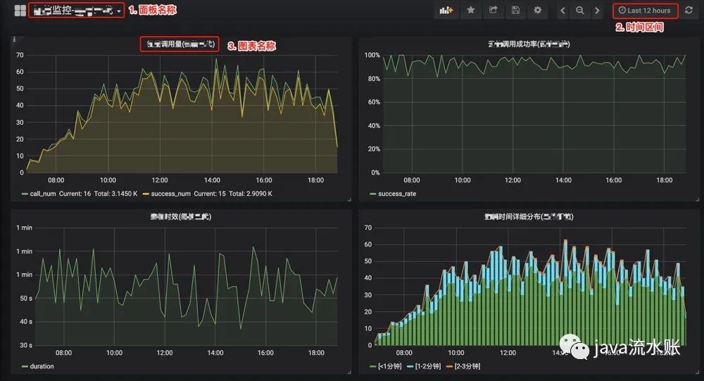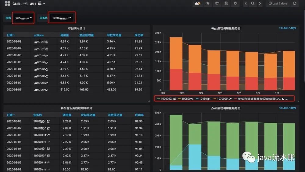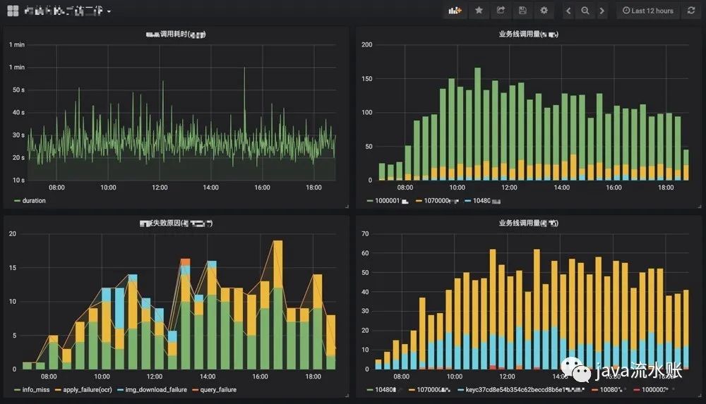 如上图所示,我做了实时的调用量、调用成功率、调用时效、流程时间分布、按照业务线区分调用量、调用失败原因分布等。