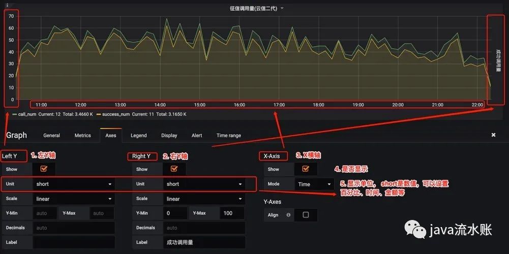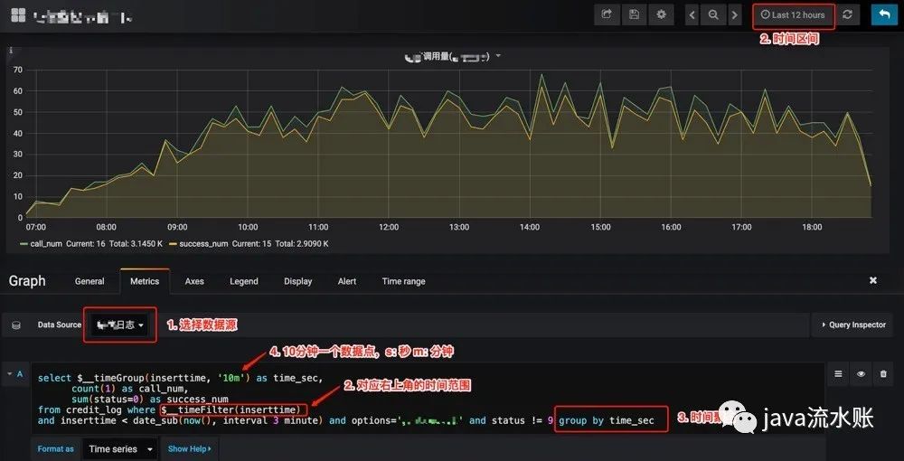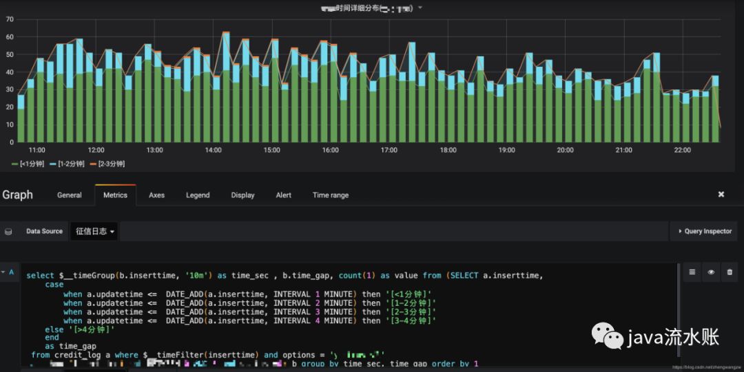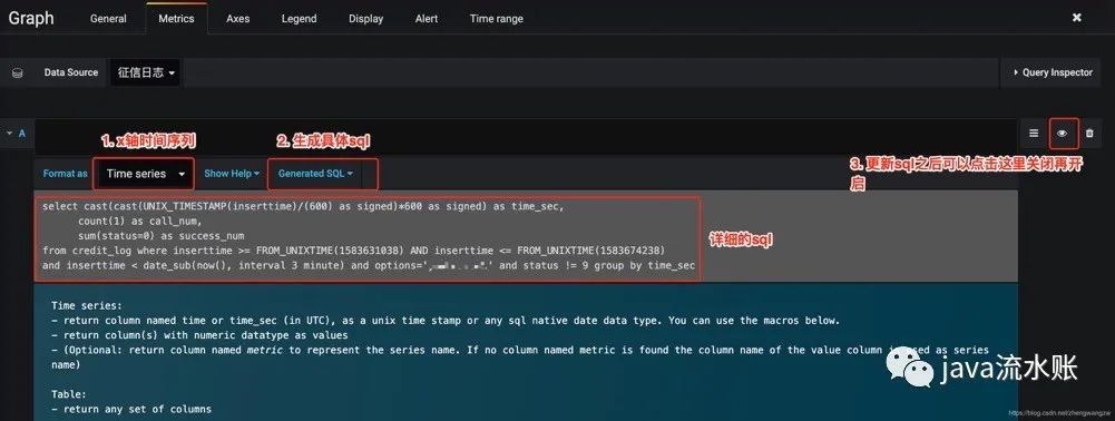 如上图所示,最重要的配置在metrics里面,选择数据源,然后写sql,简化后的sql如下: