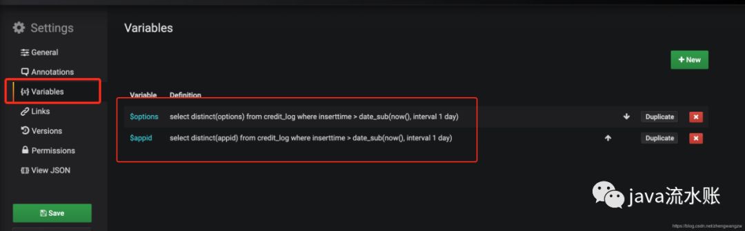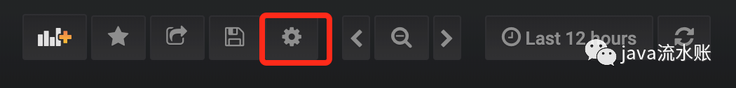 这里设置好变量之后,在图表sql中就可以使用 options∗∗就是提前创建的变量。如何创建变量呢?入口在Dashboard右上角的设置图标这里