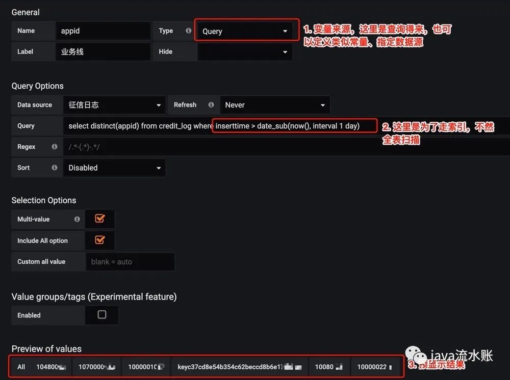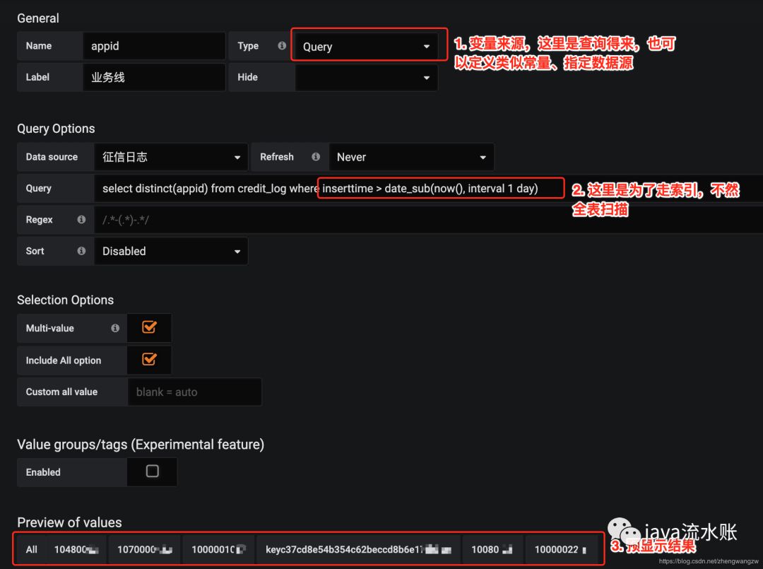 举个我这里的实际业务场景,就是很多业务线会调用我的站点,拉取外部机构的数据,那业务线和外部机构就是二个变量,我可以在grafana中提前定义好,先看效果图(以表格为例):