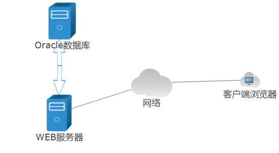 客户端即浏览器没有加载程序,程序部署在Web服务器上,客户端需要加载或浏览数据,首先通过网络将请求发送给Web服务器,Web服务器通过请求访问Oracle数据库服务器,然后Web服务器响应将数据传递展示在客户端。