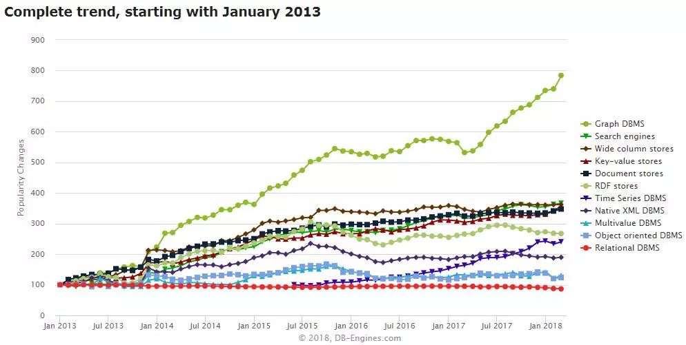 从DB-Engines的数据库趋势信息来看,从2013年至今,Graph DBMS是增长最快速的一类数据库。
