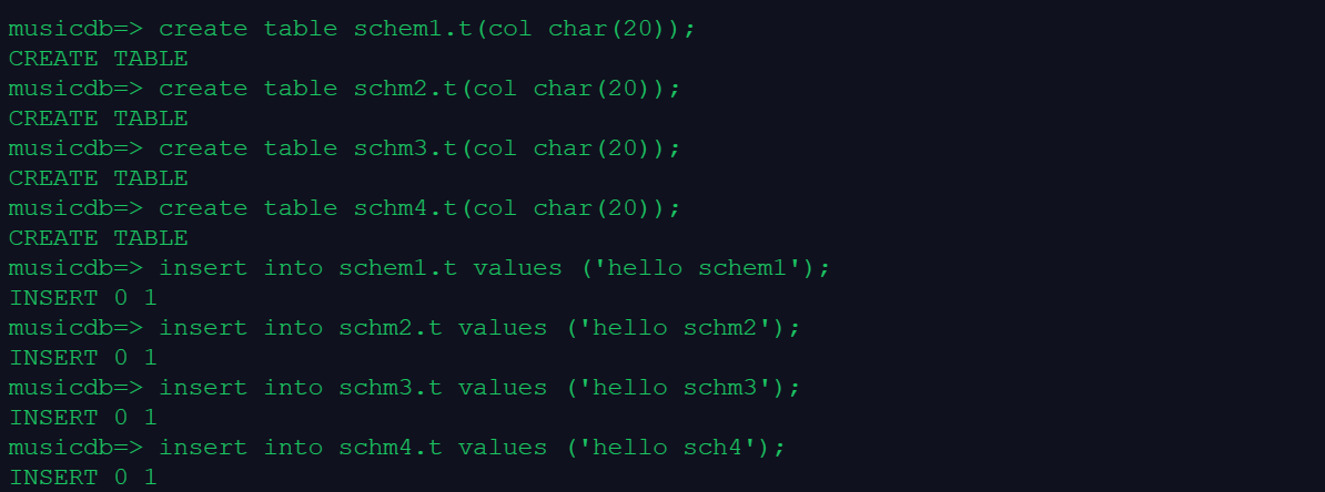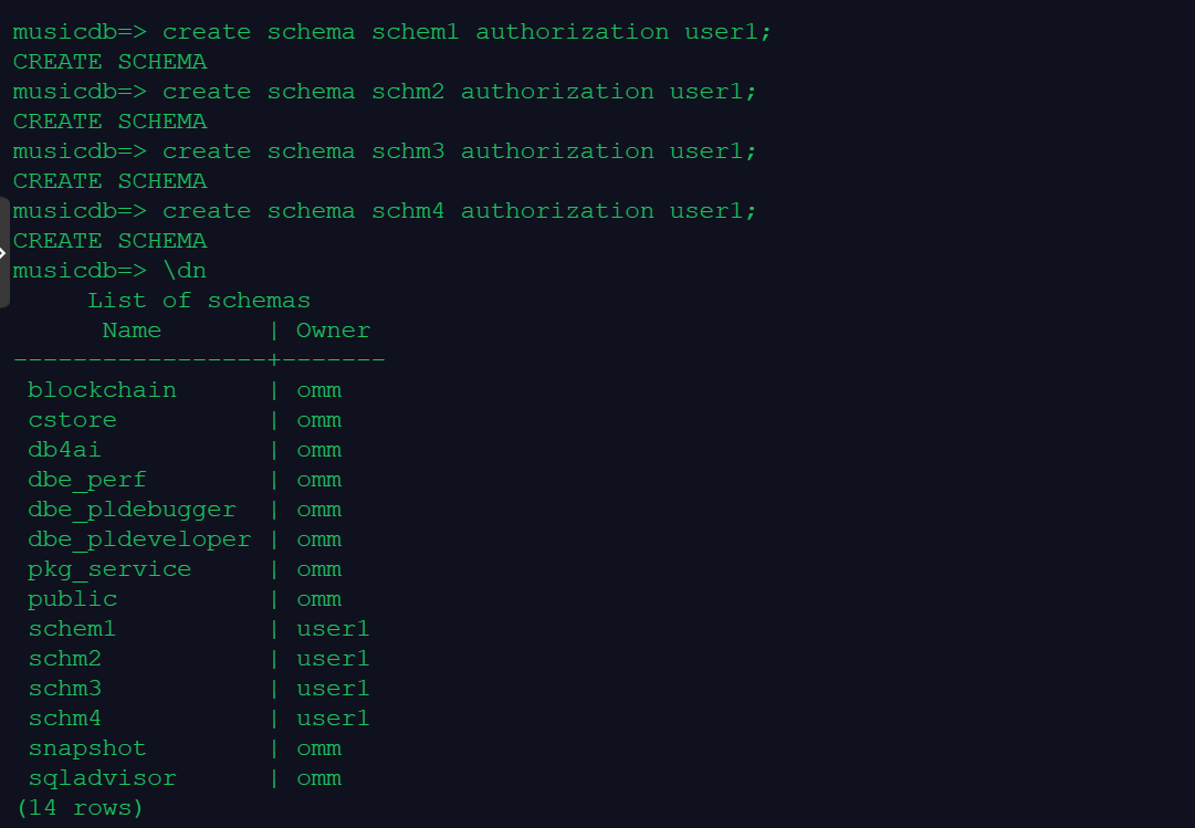 create schema schem1 authorization user1;create schema schm2 authorization user1;