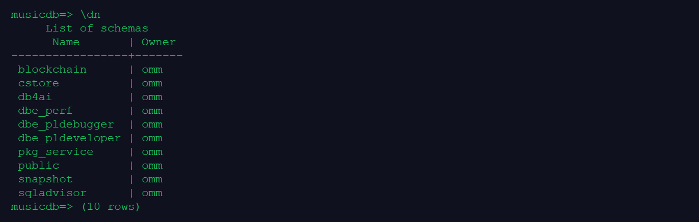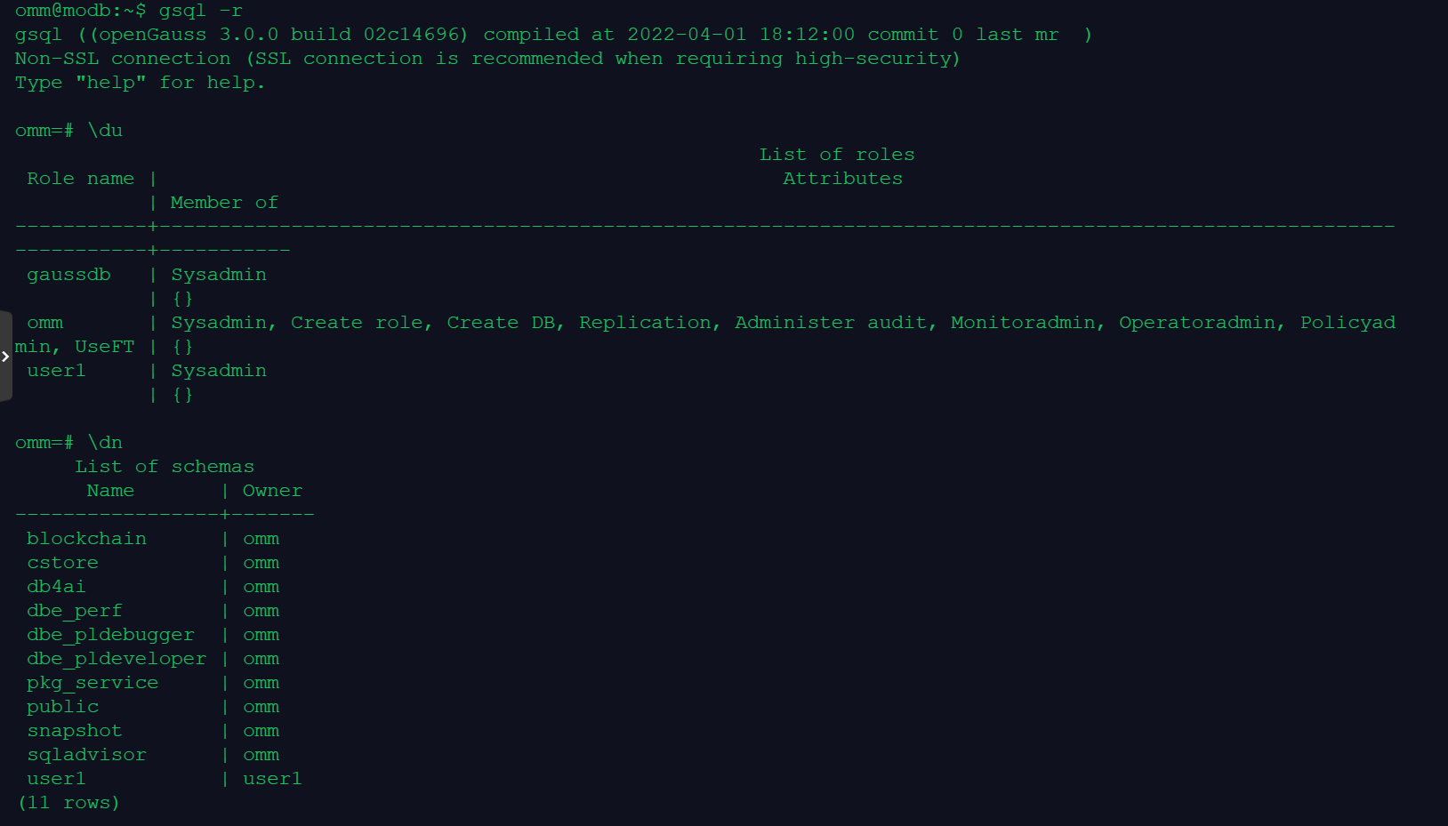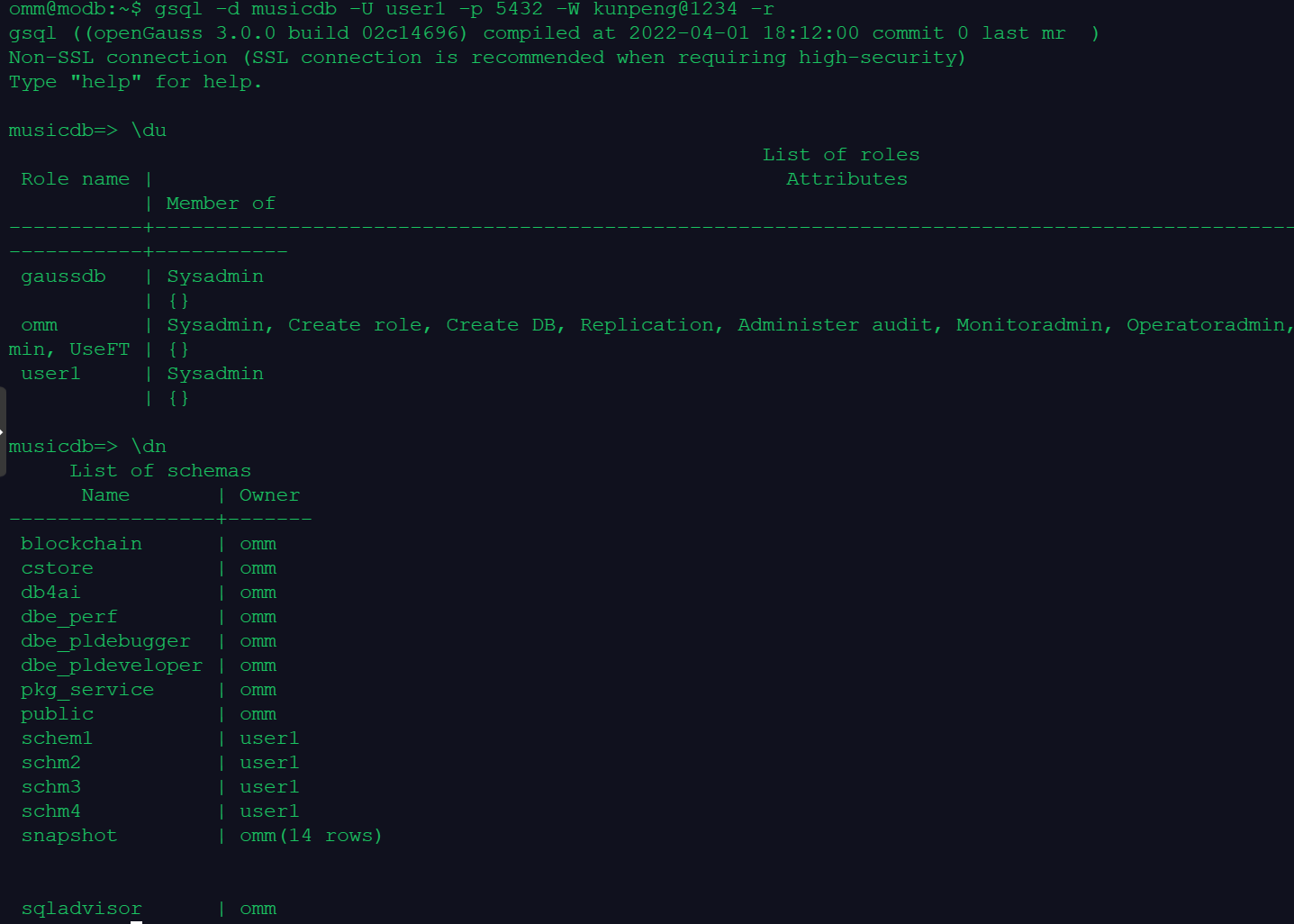 gsql -d musicdb -U user1 -p 5432 -W kunpeng@1234 -r\du \dn