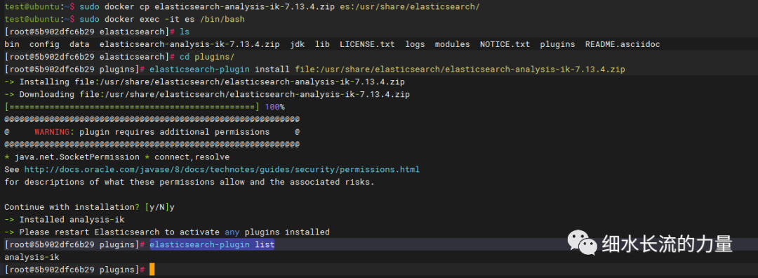 进入es容器,进入到/usr/share/elasticsearch/plugins/目录,输入安装命令: