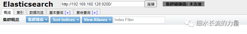 打开宿主机浏览器页面,输入“虚拟机ip:9100”,比如我这里是192.168.160.128:9100,打开后如果出现以下界面,无法连接到elasticsearch的地址,此时需要重新配置一下elasticsearch.yml文件。