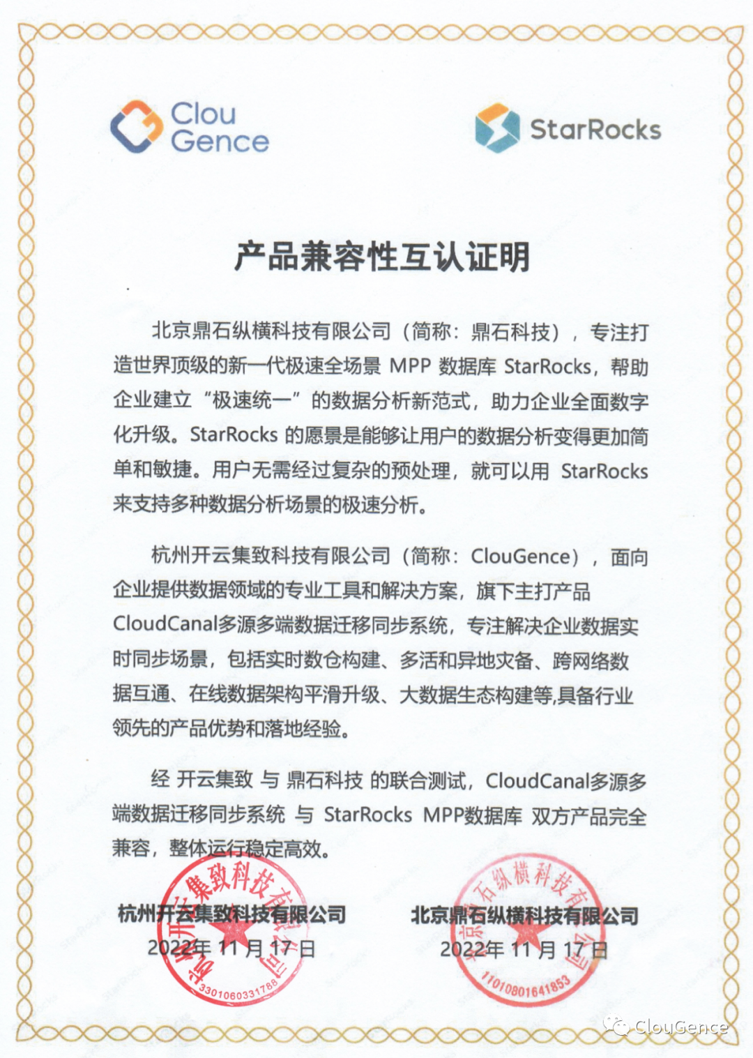 近日,ClouGence公司发行的CloudCanal多源多端数据迁移同步产品与StarRocks数据库完成产品兼容性互认证明。双方将携手致力于为用户提供更加稳定、高效、丝滑的数据迁移同步、数据分析体验。