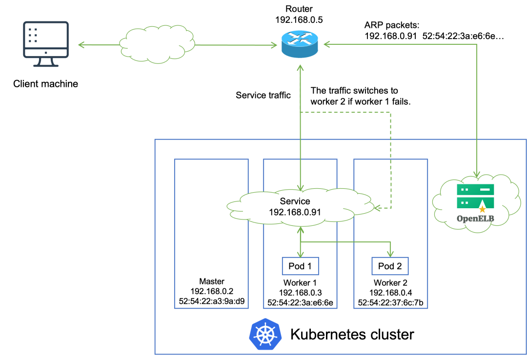 OpenELB Layer2 模式因其实现简单,而且对物理硬件和网络没有额外要求,所以实际生产中经常会用到。但目前仍存在单点故障风险,即如果 OpenELB 实例因资源不足故障,则整个对外流量将中断。