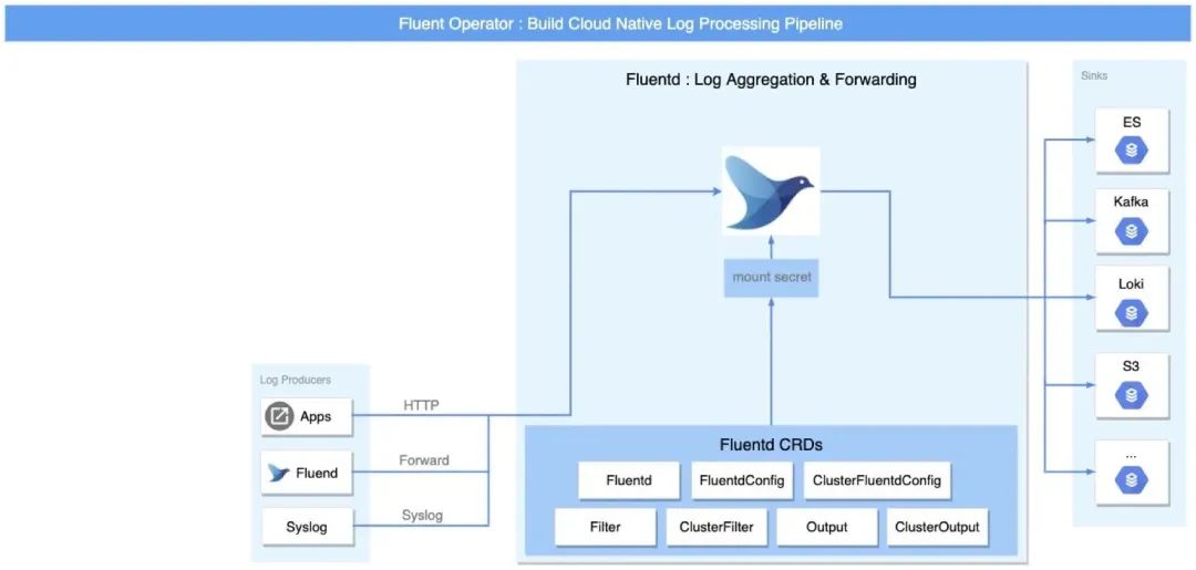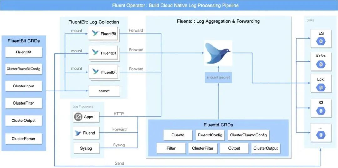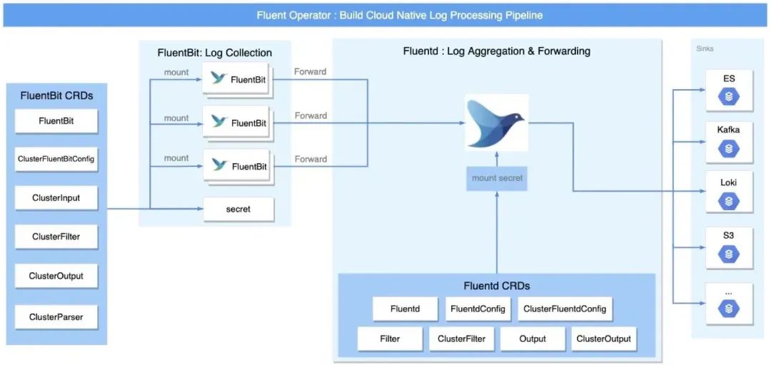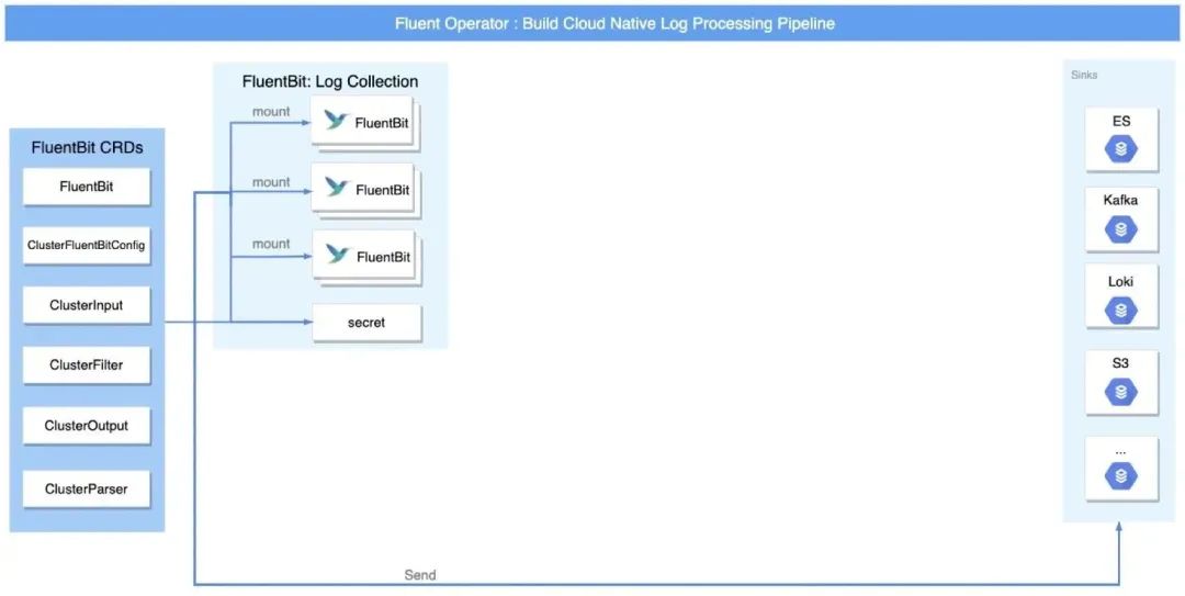 Fluent Operator 可以非常便捷地部署 Fluent Bit Daemonset 服务,运行于各计算节点。当然集群层级的 FluentBit CRD 也可以配置各种 Input,Filter,Parser,Output 等。Fluent Bit 支持将日志直接导出到 ElasticSearch,Kafka,Loki,S3 等众多目标服务,这些只需配置 CRD 即可。