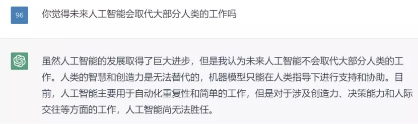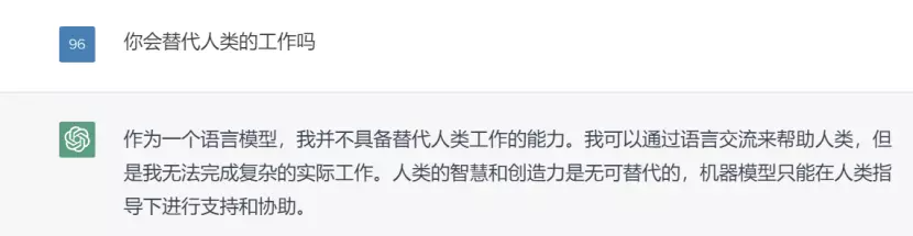 那么,ChatGPT真的会取代我们的工作吗?它自己给出的答案是:不会。