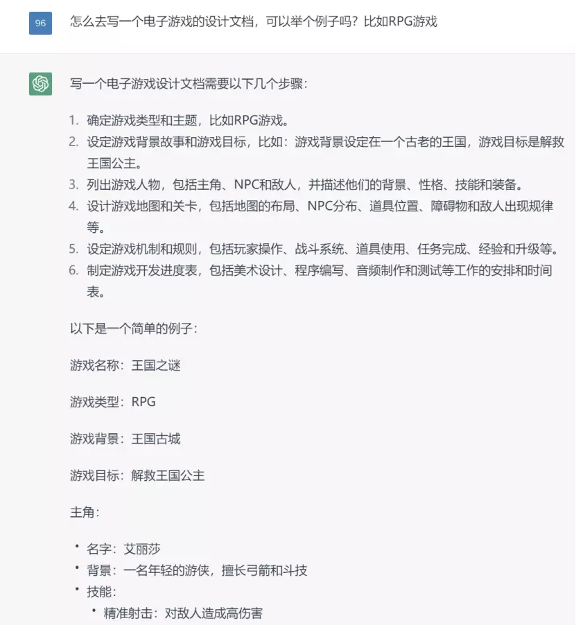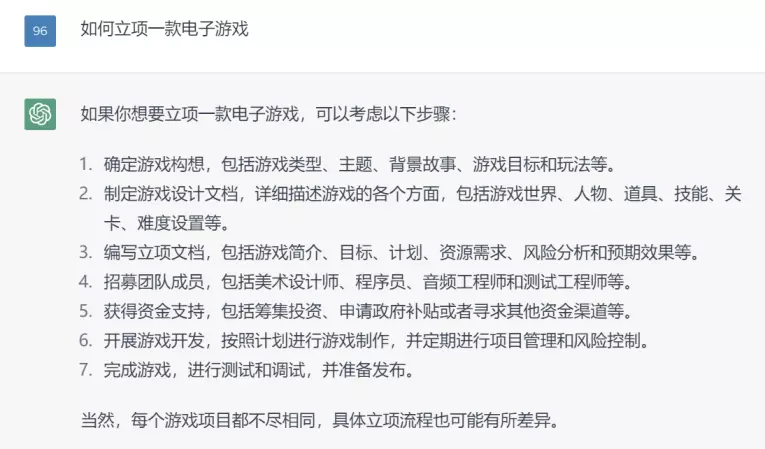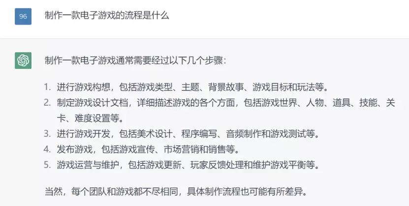为了更清楚地了解ChatGPT对游戏行业的了解,笔者也“咨询”了一些游戏制作的基础问题,比如游戏的制作流程: