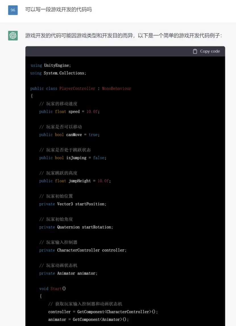 和AI绘画一样,在经过测试后,不少从业者都发现ChatGPT已经可以胜任书写游戏策划、运营文案的工作,甚至还能编写部分游戏代码和查找代码BUG。比如像《俄罗斯方块》这样的经典游戏,它甚至可以直接给出游戏代码。