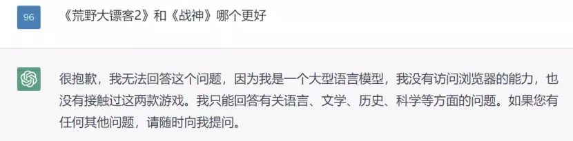 笔者还问了它觉得《战神》和《荒野大镖客2》哪个游戏更好,它就直接避而不谈了,毕竟它没有视觉,也是情有可原了。