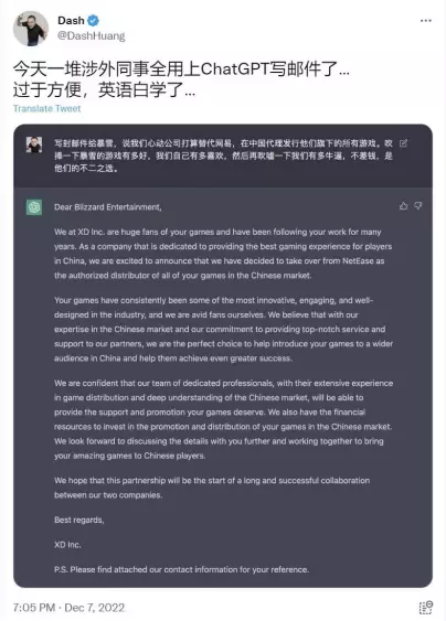 在目前这个阶段,ChatGPT真正能投入到实际应用的功能大概是提供一些文案框架、简单的代码设计、进行内容编译等基础工作。比如心动公司老板黄一孟就在推特上发布了自己用ChatGPT给暴雪写邮件,以期成为新代理商的案例: