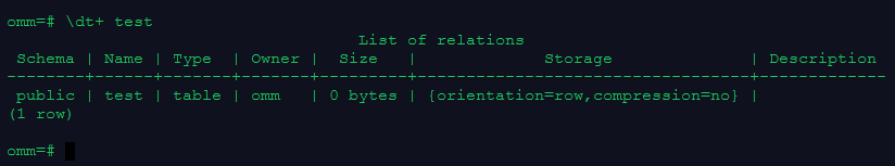 public | test | table | omm | 0 bytes | {orientation=row,compression=no} |