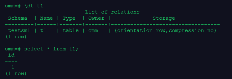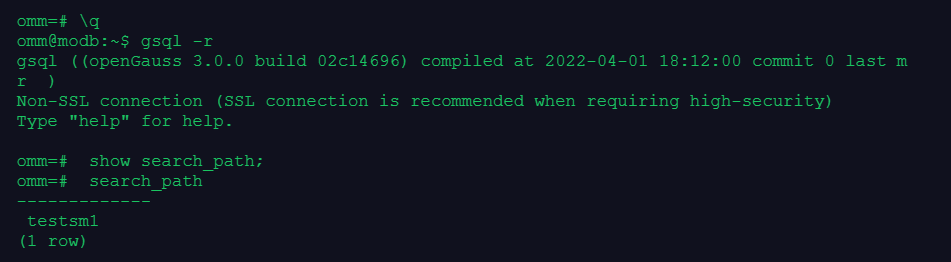 gsql -r1、创建一个名为testsm、testsm1的模式。