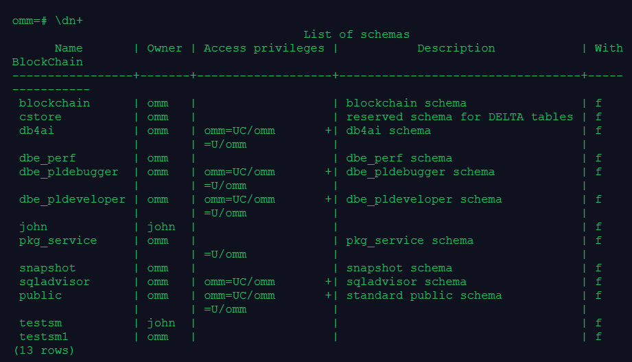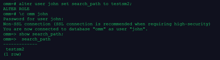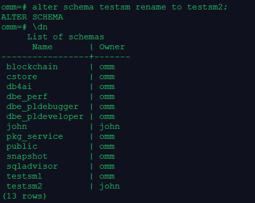 create schema testsm1;2、创建一个用户john,并将testsm的owner修改为john,并且把修改owner前后分别使用\dn+查看模式信息。