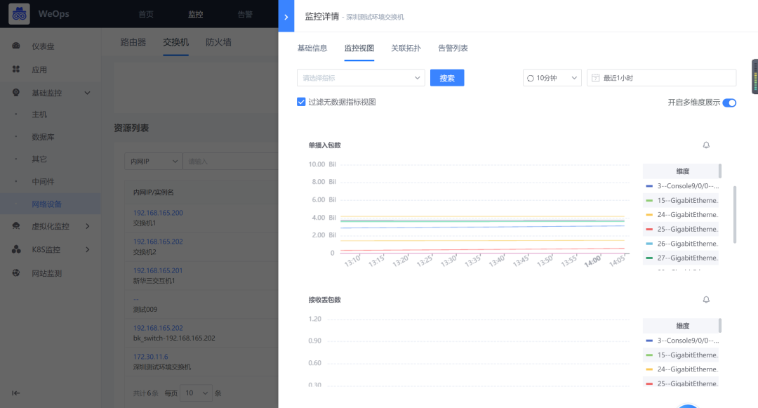 WeOpsV3.13版本优化网络设备监控的采集链路,支持不同品牌不同型号的网络设备指标导入,可设置不同品牌型号网络设备的监控采集,展示网络设备的监控视图和告警信息。