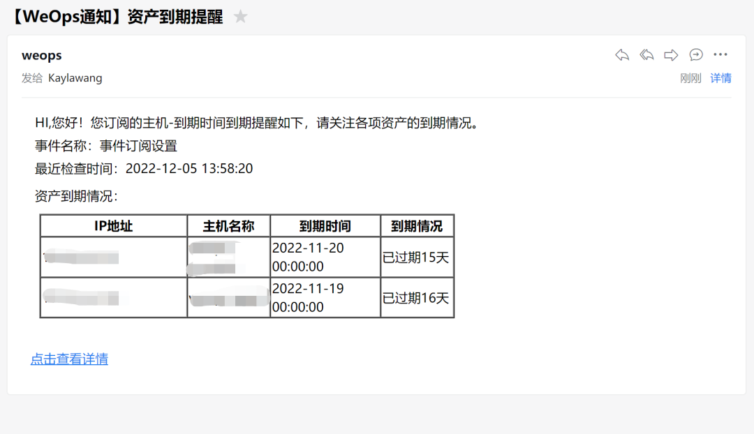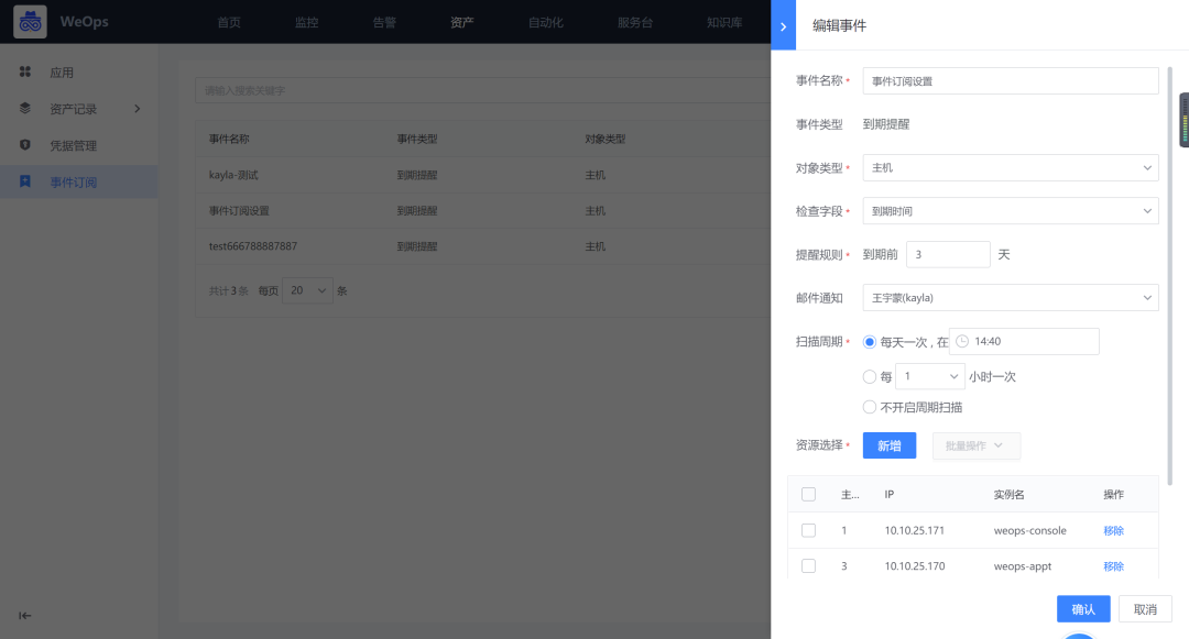 WeOpsV3.13版本新增事件订阅功能,可设置资源的到期提醒,支持每天/定期/立即扫描,获取资源到期的最新情况,并以邮件的形式通知到对应负责人,避免资源过期影响使用。