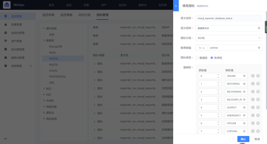 为了更好突出资源监控和告警的关键信息,V3.13版本新增指标类型和维度的设置,指标维度支持设置类型为数值型和枚举值,对于枚举值可设置映射值,对获取的监控信息进行说明;展示指标的维度,支持对维度进行隐藏/展示设置、显示名修改,设置完成后可在以下位置呈现效果。