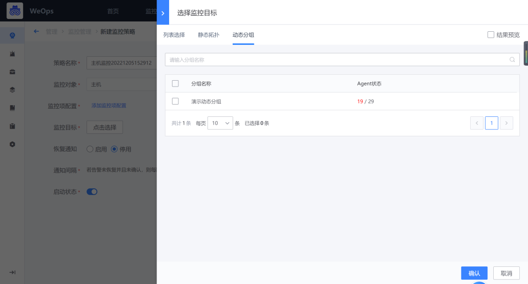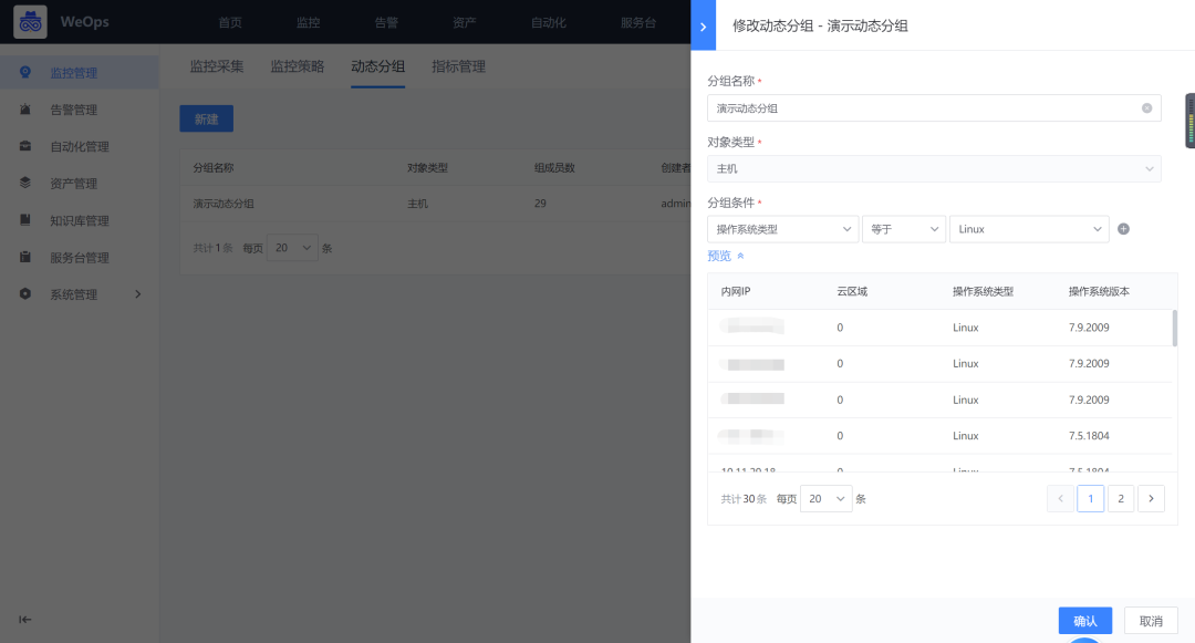 一般情况下,资源处在不断的变动中,如果出现资源的增删,需要对之前已经配置好监控策略进行调整,工作量比较大。为了解决资源变动导致监控策略调整的情况,WeOpsV3.13版本增加动态分组功能,支持按照特定条件创建分组,并在创建监控策略的时候使用该分组,一旦符合资源发生变动后,动态分组也会对应调整,监控策略的对象也同样会调整。