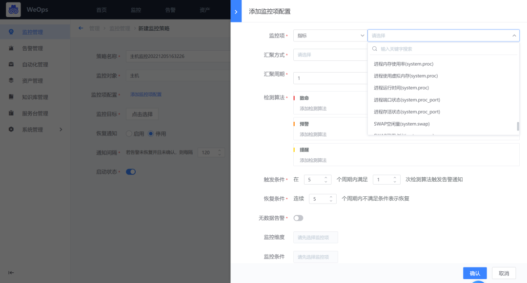 为符合监控视图展示,仅主机配置监控策略时展示和选择进程类指标