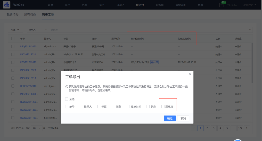 IT服务台优化:为了方便运维管理员进行工单方面的查看和导出处理,WeOpsV3.13版本新增SLA处理时间展示,新增满意度导出功能。