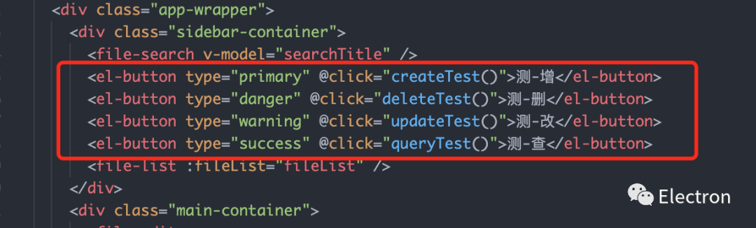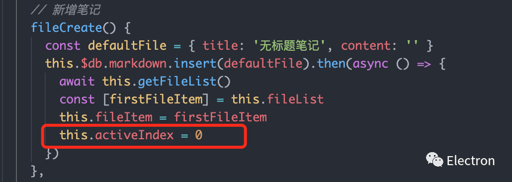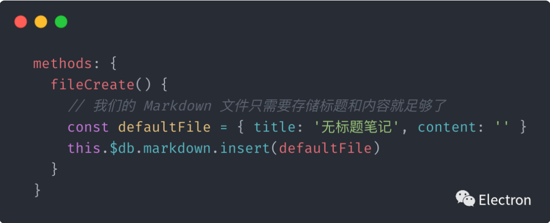 ,这里执行新增文件的逻辑,在 methods 中编写函数新增 Markdown 数据,我们上一篇已经写过 demo 了,非常简单:
