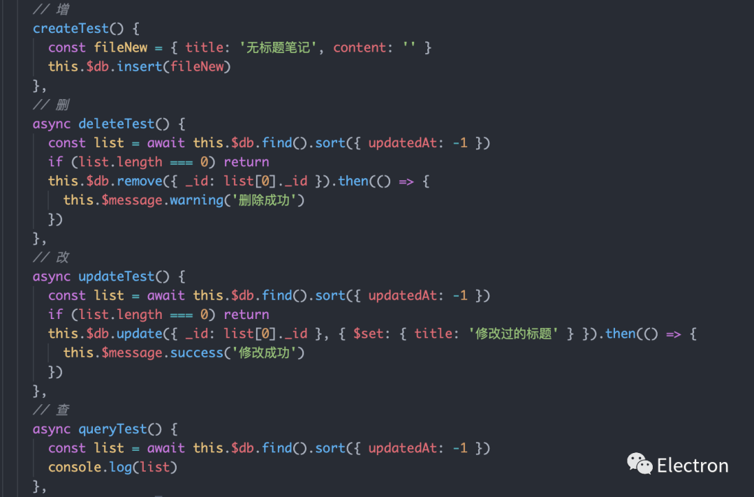 先把上一篇对数据库写的增删改查伪代码统统删掉,现在已经用不上了,如果大家对 nedb 的具体 api 还不清楚,可以直接去官网浏览即可,虽然我们是用了nedb-promises