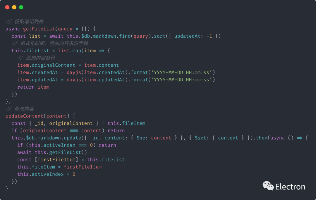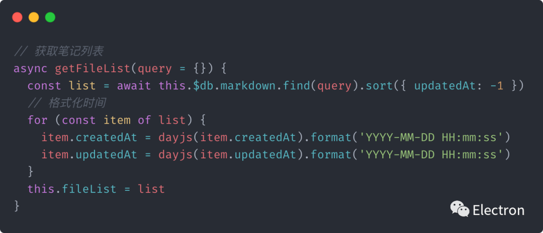 我们创建了新文件,那肯定得在左侧的列表菜单展示出来,列表是从nedb数据库中获取是毋庸置疑的了,那么我们什么时候去获取这个数据呢?每次初始化程序和创建文件、编辑文件,还有后续我们导入文件,一旦这几个状态改变的时候我们都需要重新从数据库里面拿取最新的文件数据来生成列表。好,搞起!
