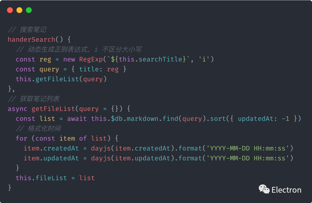结束,否则就传入需要搜索的标题名称,nedb 支持正则搜索,我们直接动态生成正则表达式,就可以实现搜索笔记的功能了,i