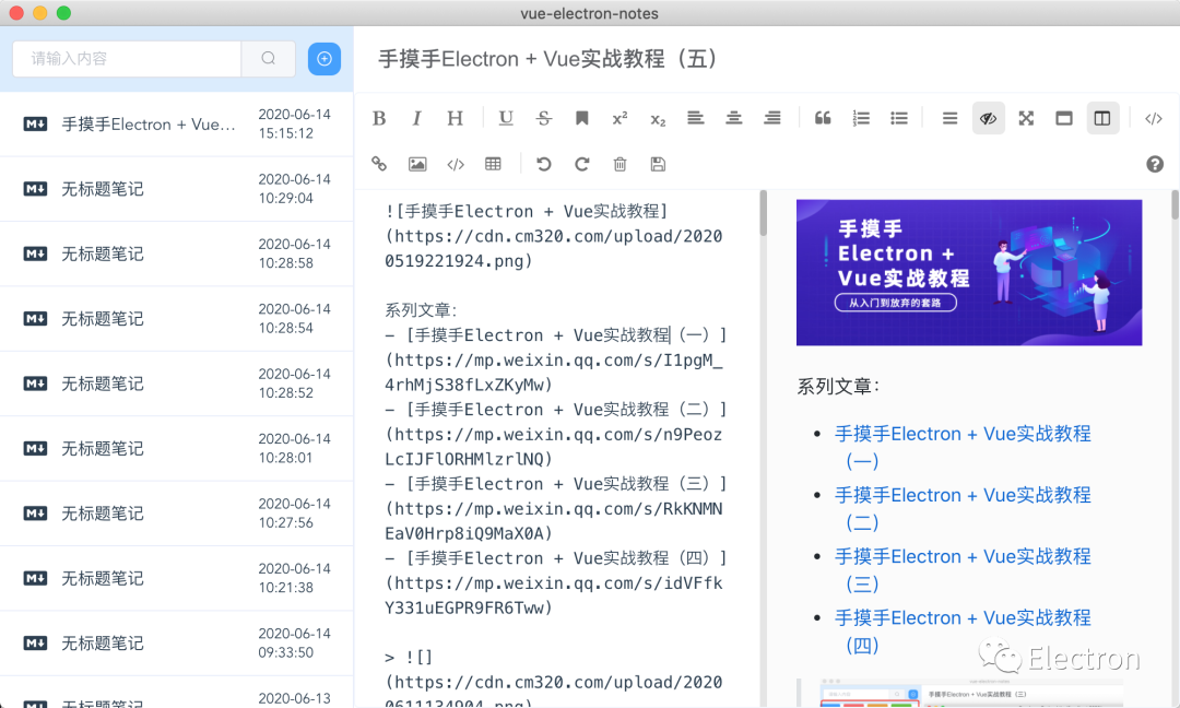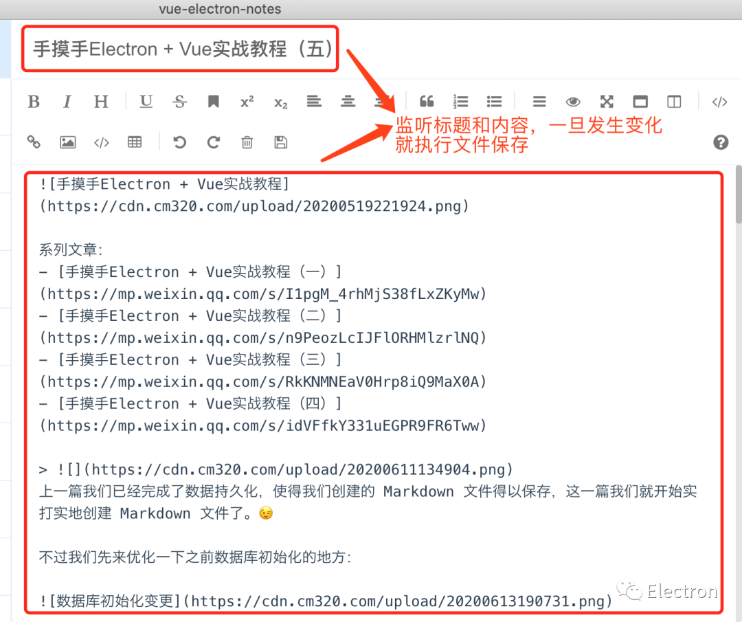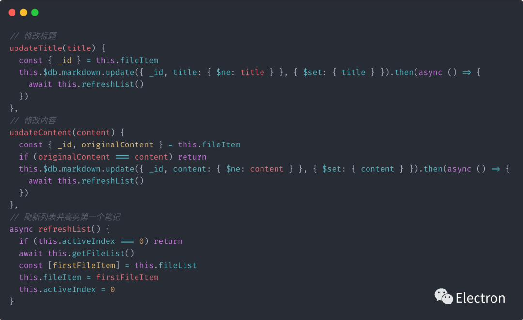 能看到这里,相信有不少人应该也看得出,这一篇内容的实现其实不是最优代码,无论在标题的保存还是内容区的保存。在获取笔记列表后新增一个字段来备份数据,这个一旦笔记多了,会大大造成内存的浪费,electron本来就吃内存,加上这个低端机估计就卡得不行了,然而我并不打算优化这一块,嗯,至少目前是木得时间来优化了,就交给各位有兴趣的大大咯。😂😂😂