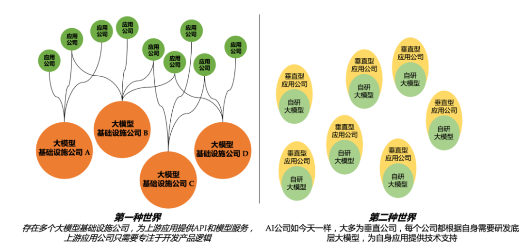 如果我和你说,未来AIGC可能有两种世界:一种世界是多个大模型基础公司,为上游应用提供API和模型服务,上游应用公司只需要专注于开发产品逻辑和上层算法;而另一种世界则如同今天的AI公司一样,每家公司都根据自身需求研发底层大模型,为自身应用提供技术支持。