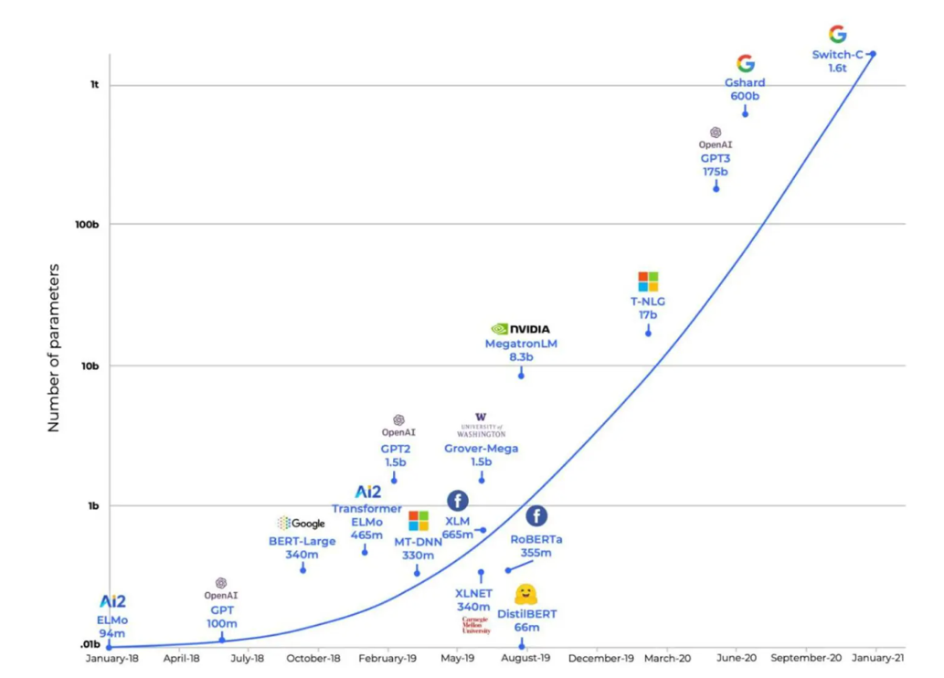 1750亿参数的GPT 3曾一度是AI历史上最大的机器学习模型,相比于15亿参数量的GPT 2,GPT 3参数量提高约117倍,预训练的数据量也从50 GB提高到570 GB。2020年发布GPT 3的时候,OpenAI并没有将工作重点放在模型结构的创新上,反而是进行了大量工程化的工作,充分展示GPT 3通过Zero-Shot、One-Shot和Few-Shots(即不需要额外数据进行微调,直接给出几个样例就可以让模型做出正确的生成)等Prompt方法完成多种NLP任务的通用性和泛化能力。通过释放出API接口供公众调用,GPT-3的商业化也正式提上日程。GPT-3展示出惊人的效果后,一年后顶级实验室和科技大厂陆续发布自己的NLP预训练大模型,模型参数量呈现指数级别的增长。