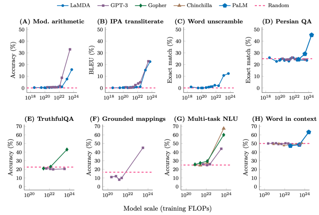 同样,论文Emergent Abilities of Large Language Models中也有类似的实验证明,当模型达到临界大小时,许多NLP能力会不可预测地出现——涌现规律。
