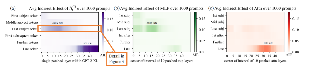 如上图所示,我们可以看到MLP模块在早期起到了决定性的作用 (MLP 6.6% AIE vs. attention 1.6% AIE),而attention模块则是在最后一个token处比较重要。