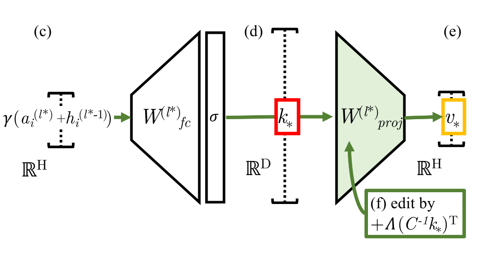 在本文中,ROME使用针对MLP参数的一阶编辑来直接写入新的键值对,也就是为模型注入新的知识。如上图所示,(d) 处的向量表示要插入的主体的键,而 (e) 处的输出编码了有关该主体的知识。ROME通过对键值间映射矩阵 进行一阶编辑 (f) 来插入新的键值对 :