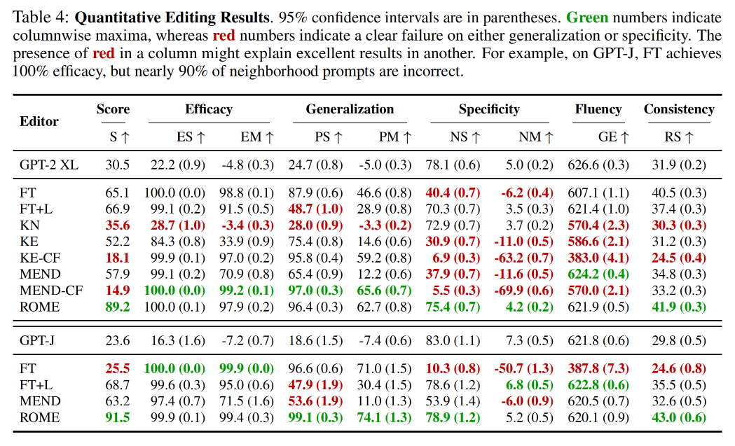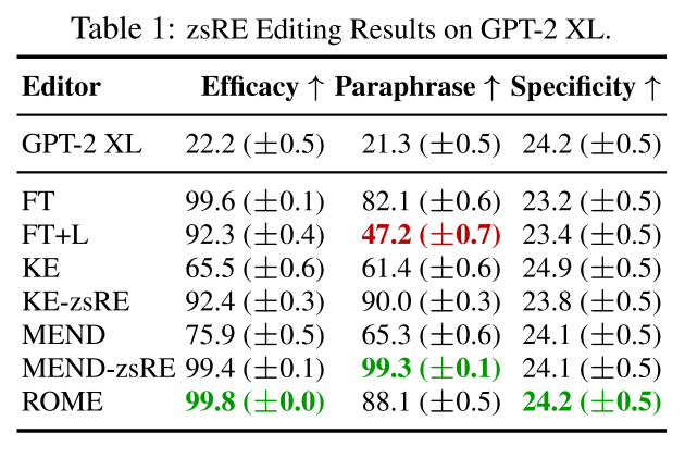 除了ROME之外,之前所有的方法都或多或少有以下两个问题: (1) 对反事实陈述过度拟合,无法泛化 (Generalization); 以及 (2) 对不相关的一些主体欠拟合并预测相同的输出 (Specificity)。而ROME则避免了这些问题,很好的实现了 Generalization 以及 Specificity 的目标。
