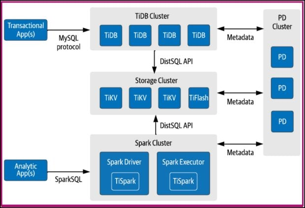 如下图 1 所示,TiDB 采用微服务设计,TiDB 查询层、TiKV MySQL 数据库、TiFlash 列式数据库、Spark 节点和元数据管理都作为可扩展的微服务部署在各自的集群中。这种设计将计算密集型工作与存储密集型工作分开,因为查询层和数据库层是独立可扩展的。
