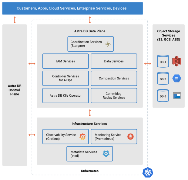 Astra DB 作为托管服务在多个云区域提供。每个区域包含一个由上述服务组成的数据平面,由 Kubernetes 操作员管理,以及基础设施服务,包括用于可观察性的Kube- Promethus堆栈和用于元数据管理的 etcd。数据平面由可以在一个或多个云中运行的控制平面管理,以执行诸如管理客户帐户和数据库以及在新区域中配置 Kubernetes 集群等任务。