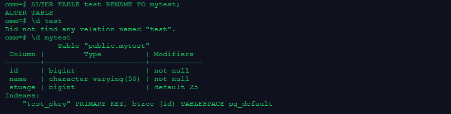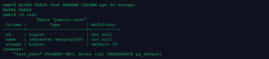 ALTER TABLE test RENAME COLUMN age TO stuage;