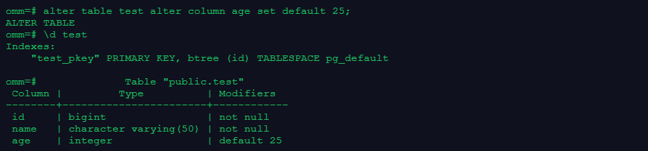 alter table test alter column age set default 25;