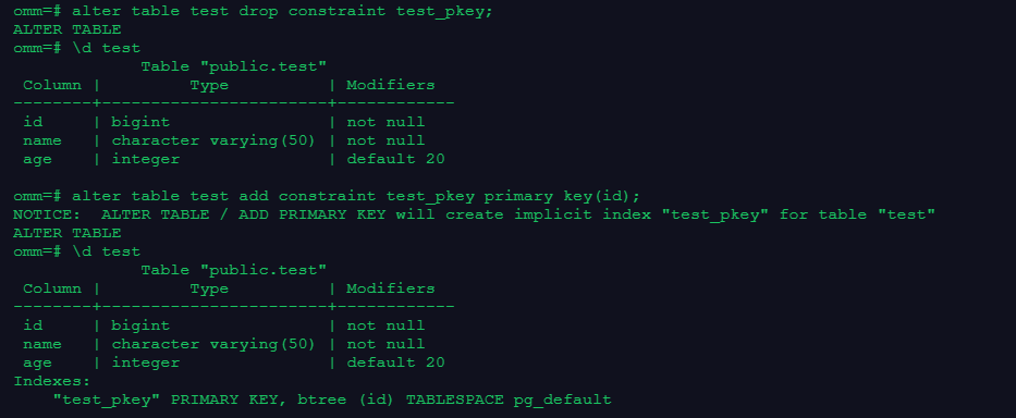 alter table test add constraint test_pkey primary key(id);
