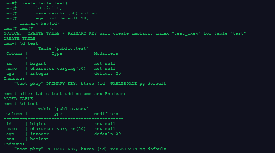 alter table test add column sex Boolean;