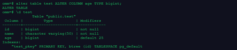 alter table test ALTER COLUMN age TYPE bigint;