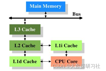 典型计算机的存储层次结构如下图所示,存储媒介距离CPU越近,则访问数据的速度越快。
